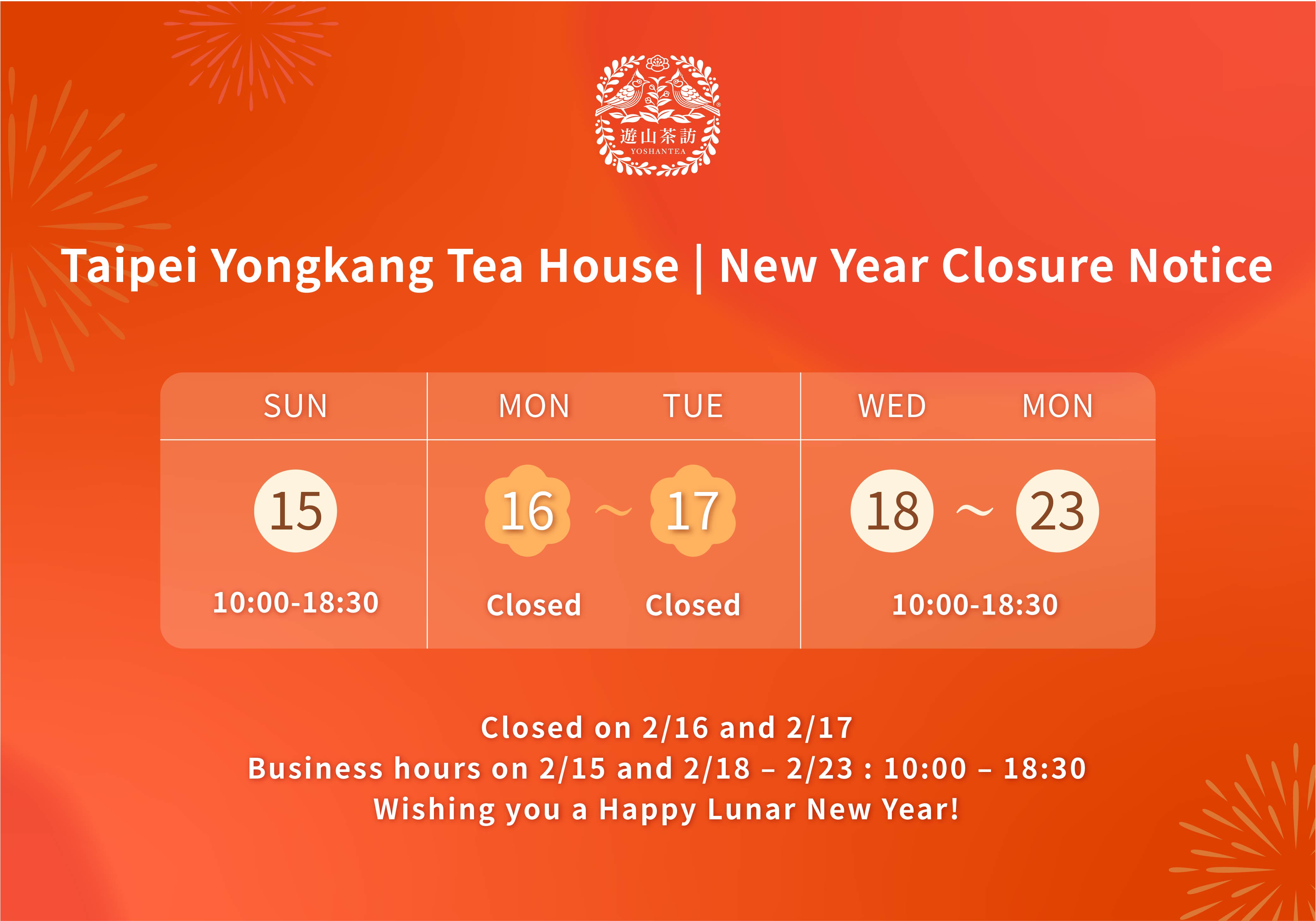 We would like to inform you about the Spring Festival business hours for the YOSHANTEA Tea Culture House and YOSHANTEA Taipei Yongkang Tea House: